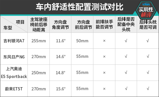 主驾驶座椅前后移动距离方面,东风日产N6和蔚来ET5T的测试数值达到270mm,并列第一。上汽奥迪E5 Sportback排名垫底,成绩为250mm。方向盘调节方面,蔚来ET5T的角度调节为15.6°,表现最佳;前后距离调节方面,东风日产N6、上汽奥迪E5 Sportback和蔚来ET5T的测试成绩均达到55mm,并列第一。反观吉利银河A7,两项测试成绩均不够理想,方向盘可调节范围较小。
