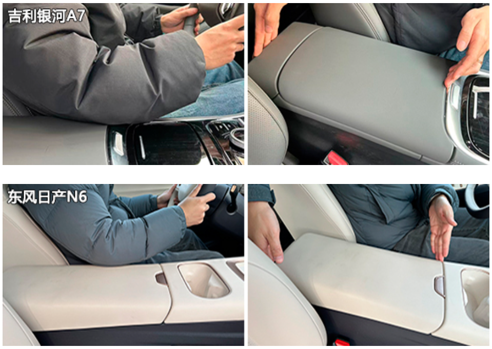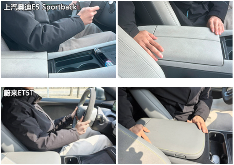 前排中央扶手方面,四款车型均采用软性材料包裹,触感舒适。其中,上汽奥迪E5 Sportback表面采用翻毛材质,防滑效果不错。虽然扶手都不支持前后移动或角度调节,但是得益于适中的尺寸以及合理的位置,正常坐姿下,还是能够为驾驶员手肘提供有效支撑。