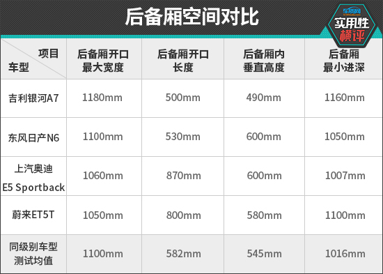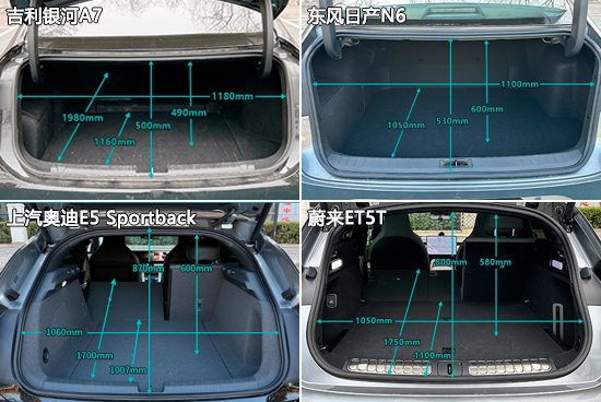 综合来看,本期参与对比的四款新能源中型车在实用性方面的表现可以令人满意。当然,四款车型也都存在需要改进的地方,例如吉利银河A7方向盘可调节范围较小,东风日产N6的视野盲区偏大,上汽奥迪E5 Sportback的USB接口种类单一,蔚来ET5T的中间头枕面积较小且支撑不足等。不过,以上这些问题并不影响日常使用,消费者可根据自身需求选择合适的车型。