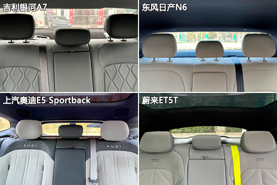 车内舒适性方面,四款车型的后排全部配备了三个头枕且均支持上下调节,但都存在中间头枕尺寸较小的情况。其中,东风日产N6和蔚来ET5T的中间头枕对头部支撑欠佳,会对舒适性产生一定的影响。