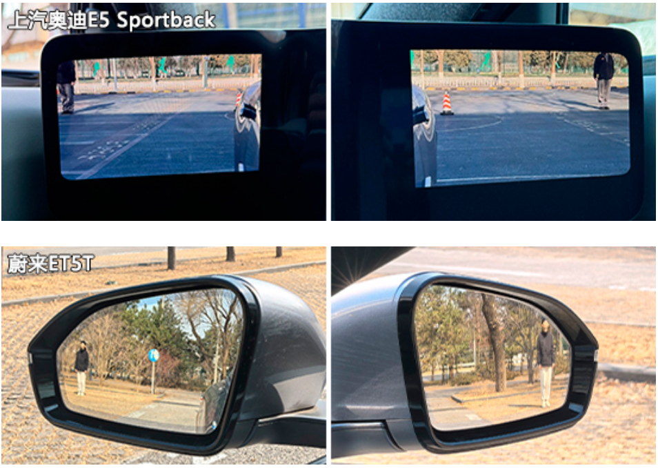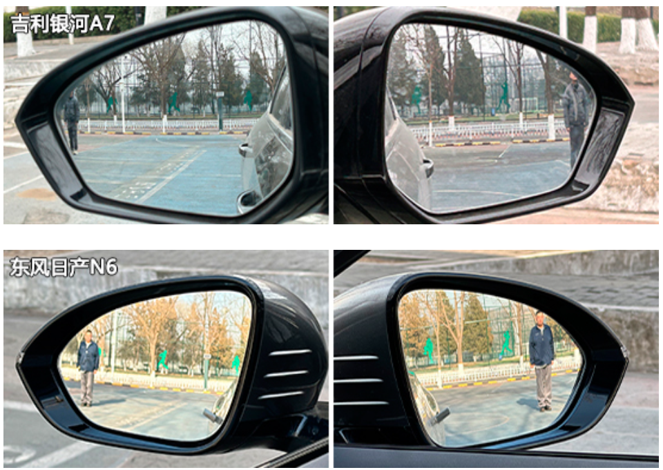 在外后视镜视野范围测试环节中,除上汽奥迪E5 Sportback采用电子外后视镜外,其余车型均为普通镜片外后视镜。测试数据方面,吉利银河A7和上汽奥迪E5 Sportback的左右外后视镜视野成绩均优于同级别车型测试均值,可为驾驶者提供更为宽阔的外后视镜视野。相比之下,东风日产N6的表现一般,特别是左侧外后视镜,测试成绩在四款车型中垫底,视野盲区偏大。