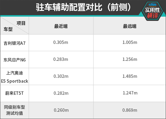 安全配置方面,在前驻车雷达测试中,根据已有测试数据来看,上汽奥迪E5 Sportback的探测能力最强,最远探测距离为1.485m。在最近提示距离方面,东风日产N6和蔚来ET5T的测试成绩与同级别车型测试均值较为接近,表现好于另外两款车型。