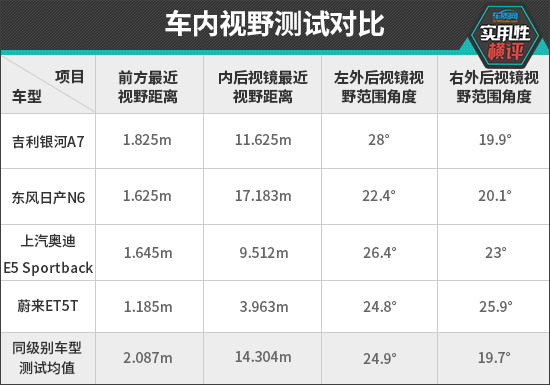 实测过程中,蔚来ET5T在前方最近视野距离和内后视镜最近视野距离测试中均表现最佳,测试成绩全部达到同级别上游水平。吉利银河A7虽然前方最近视野距离成绩垫底,但也优于同级别均值;东风日产N6内后视镜最近视野距离表现最差,甚至达到了17.183m,后方视野盲区较大。